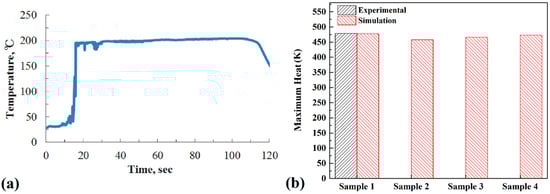 (a) Experimental results of sample 1 [44]; (b) comparison between maximum heat generation from simulation results and experimental data.
