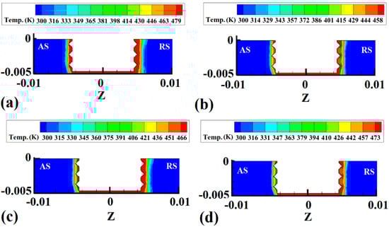 Cross-section view of internal temperature gradient obtained from the simulation results: (a) sample 1, (b) sample 2, (c) sample 3, and (d) sample 4.
