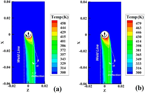 As discussed before, due to the rotational direction of the tool, heat distribution on the retreating side was more significant than on the advancing side. This behavior was recorded in all samples. In the noncontact shoulder case, the generated heat inside the joint line diffused onto the surface. According to the simulation results, the deformation angle increased as the FSJ tool rotational speed increased and the tool traveling velocity decreased. The deflection angle was seemingly related to the total heat generation during the FSJ process. The deflection temperature gradient built up in the RS of the surface, and the higher amount of heat diffused in the RS was seemingly caused by the compression of hot polymer.