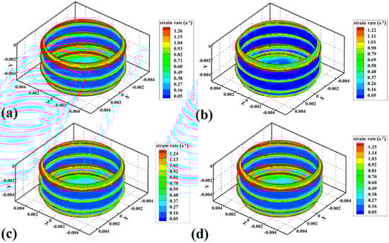 Simulation results of strain rate in (a) sample 1, (b) sample 2, (c) sample 3, and (d) sample 4.