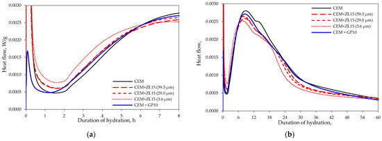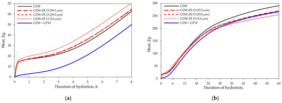 However, the induction period in the mixtures with glass powder is the shortest. After two hours of hydration, the heat release in the specimen containing glass powder is comparable to the specimens where part of the cement is replaced with zeolite that has an average particle size of 59.3 or 29.0 μm. After about 6 h of hydration, the heat flow (Figure 4b) in the specimen containing only cement exceeded the heat flow of the specimen where part of the cement was replaced with glass powder, but the heat flow in the specimen containing glass powder became the highest between 22 and 32 h of hydration.