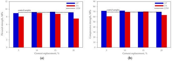 The mechanical properties of mortars No 1 were tested in order to find the optimum amount of the mineral material that could be used to achieve the best zeolite and glass powder ratio. Our previous tests [42] showed that the pozzolanic activity of the zeolite used in our research became evident after 60–90 days. Therefore, a decision was made to conduct tests only after 90 days. Figure 6a shows that zeolite has a negative effect on the flexural strength, i.e., all specimens where part of the cement was replaced with zeolite demonstrated lower resistance to bending than the control specimens, whereas the specimens where cement was replaced with glass power resisted failure in bending, in a similar way to the control specimens, ranging within a ±2.3% limit.