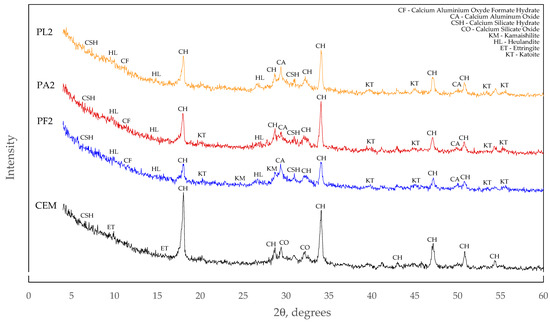 The X-ray diffraction analysis revealed the absence of ettringite in all compositions where part of the cement was replaced by a mixture of mineral additives. Presumably, the ettringite content reduced in proportion to the reduced cement content in the mixture and the remaining amount of ettringite was not sufficient to be captured by this method of analysis.