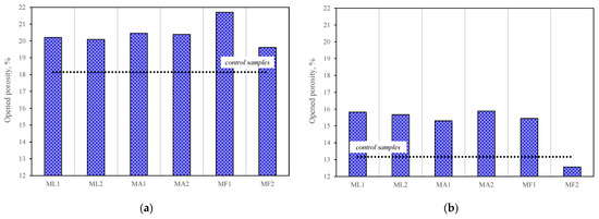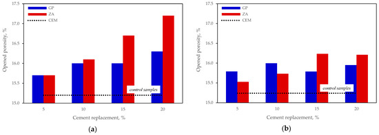Open porosity of mortars No 2: (a) after 28 days; (b) after 90 days.