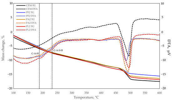 Minor endothermic effects at approx. 190 °C and 230 °C temperature marked by dotted lines in Figure 11 should also be noted. As the control specimen did not have such effects, it is possible that they can be caused by calcium aluminate hydrates, which were observed in the XRD images. Taking into consideration the decomposition temperatures of typical cement clinker hydration products described in the literature [44], it is very likely that calcium aluminate and calcium aluminate silicate hydrates decompose at these temperatures.