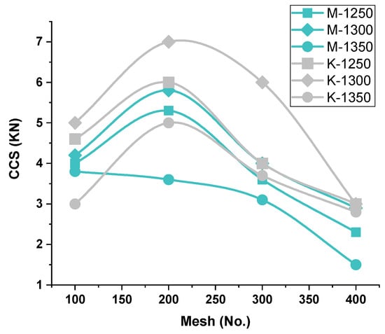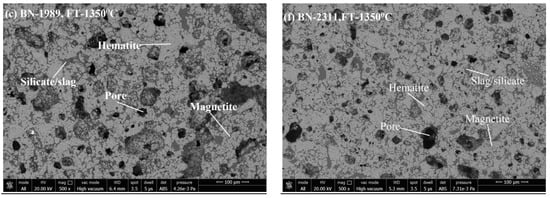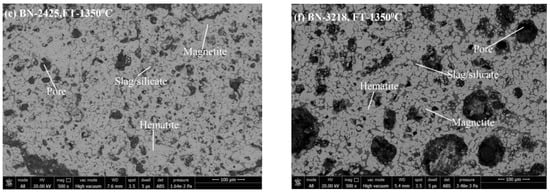 Since iron ore No.1 and 2 pellets both are hematite ore, hematite begins to react above 1280 °C, while initial crystal formation promotes the strength. Calcium silicate starts to melt and form liquid silicate of calcium ferrite (SCF) at 1250 °C. Al2O3 prone area SCF reacts with and forms SCFA, which is stable at 1300 °C, and liquid phase calcium silicate and iron silicate slag phase are remaining. Firing at 1300 °C initiates the crystal bridging and recrystallization. Secondary hematite starts to sinter by grain growth in the presence of the slag phase, which enhances the process due to ion migration. The hematite reduction phenomenon produces secondary magnetite (secondary hematite), which contributes to forming slag/silicate melt to promote diffusion bonding [22,23,24]. Hence, the strength of pellets is enhanced. Owing to this behavior, pellets roasted at 1300 °C exhibit a higher C.C.S. value, as compared to pellets fired at other firing temperatures of both Iron Ore No.1 and 2 pellets of respective Blaine fineness (1312–1678–2425–3218 cm2/g of Iron Ore No.1 and 2311–2879–3461 cm2/g of Iron Ore No.2), as shown in Figure 3.