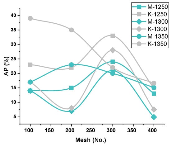 Hematite grains, under a reductive environment during heating, reduce to magnetite. This phenomenon occurs in the outer shell of pellets. Oxidation of magnetite produces secondary hematite. As Figure 8 shows, the hematite phase grain density (H.P.G.D.) is the highest at a temperature 1300 °C for the Blaine, corresponding to 200 mesh numbers for both types of ores. The high grain density of hematite depicts the high strength of pellets. Although the C.C.S. value is high for the pellet K2B, comparatively, M2B shows less H.P.G.D. due to the high Blaine 2311 cm2/g compared to 1678 cm2/g in K2B. This is so because finer particles are more active during the sintering process, and due to fineness, the distribution of grains happens more uniformly. Their distribution shows high grain density, but coarser grains with silicates support the strength. As noted, H.P.G.D. is considerably higher, in respect to Blaine fineness of the Iron Ore No.2 pellet than Iron Ore No.1 pellets, corresponding to firing temperature. The strength of pellets is the collaborative contribution of different phase proportions, with grain distribution corresponding to the firing cycle and ingredients of the pellets mixture. Here, the effect of fineness over the distribution of grains, envisaged as a finer one particle, takes part in the reaction first. Iron Ore No.1 and No.2 pellets, beyond 200 mesh H.P.G.D., decrease due to the increment of finer particle proportion. Firing at a temperature 1350 °C lowers the H.P.G.D. for both types of Iron Ore No.1 and No.2 pellets, showing that, at high temperature, high liquid melt supports faster Fe3+ diffusion through melting, and assimilation is prevails to decrease H.P.G.D. [34].