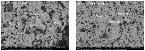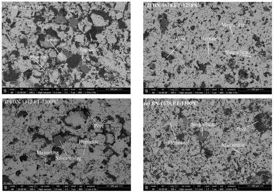 The fineness of ore and the bonds between the grains affect the pellet’s reducibility. Porosity of pellets supports the reducibility. Carbon addition accesses the various reactions, such as hematite reduction-produced magnetite conversion, to secondary hematite, which is less reducible than primary hematite because increasing the firing temperature lowers the reducibility. Iron Ore No.2 pellets have more fineness preventing oxygen removal, which decreases the reducibility [21,38]. The pellets fired at 1250 °C reflect the higher reducibility since they have a lower magnetite phase and less silicate/slag bond with a higher pore phase. Pellets fired at 1350 °C have more slag bonding with reduced pore phase, less density, and more magnetite grains, presenting the lower reducibility shown in Figure 18 [4].