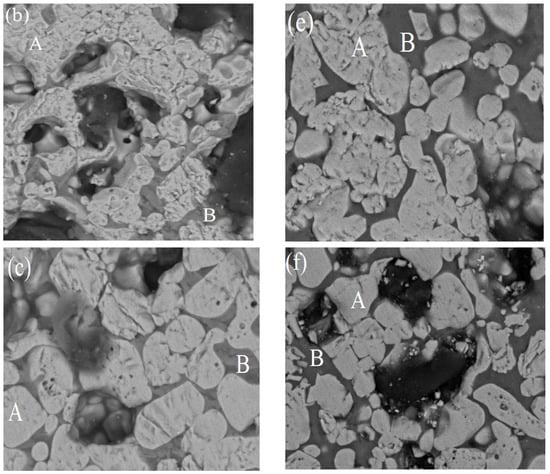 Microstructure images reveal the phase formation during thermal processing and the physico-chemical reaction. Formation of various phases of hematite appears as (grey-white), magnetite (grey-white with pinkish), pores (black shade), and silicate/slag (dark grey) in the microstructure. With its application of grain density in each phase, the size of grains and the phase’s area have been analyzed. Figure 5a–c shows the SEM image of pellets K1A, K1B, and K1C; Figure 5d–f show the SEM image of pellets K2A, K2B, and K2C. Figure 6a–c represent the pellets K3A, K3B, and K3C; Figure 6d–f show the pellets K4A, K4B, and K4C. Similarly, Figure 7a–c show pellets M1A, M1B, and M1C; Figure 7d–f show pellets M2A, M2B, and M2C. Figure 8a–c depict the pellets M3A, M3B, and M3C; Figure 8d–f depict the pellets M4A, M4B, and M4C [10].