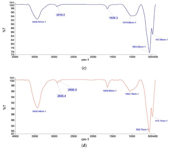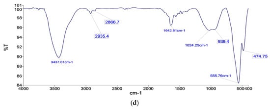 The pellets K4C iron oxides (hematite) peak 474.75 cm−1 and 557.66 cm−1 good enough compare to M4C, less absorbance of iron oxides (hematite) peak 473.14 cm−1 and 550.74 cm−1, as shown in Figure 15d and Figure 16d. Silicate/slag phase peaks, 1042.25 cm−1 (for K4C) and 1052.76 cm−1 (for M4C) with higher wavelengths, provide a little more strength. The firing temperature reached 1350 °C, and a liquid silicate phase occurring due to over sintering and unstable phases were seen. Such unstable compound phases are captured as a stretched bond group. The hydroxyl group and stretched O-H groups stretched and sharp bands have appeared as the peaks 3437.01 cm−1 and 2866.7–2935.4 cm−1, respectively, for K4C. These peaks marginally influence the pellet’s structural strength, as compared to M4C pellets (hydroxyl group and stretched O-H groups stretched) peaks 3435.48 cm−1 and 2850.5–2935.4 cm−1 with less negative influence on the strength of pellets [10].