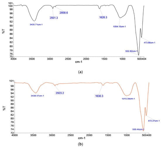 Pellets K1A and M1A show significant C.C.S. after K2B/M2B pellets, in their respective places, and K1A shows good strength compared to M1A. K1A has 471.30 cm−1 and 550.53 cm−1 great absorbance of 71%, compared to M1A pellets of hematite’s peaks, 473.89 cm−1 and 552.82 cm−1, which have 75% absorbance, as shown in Figure 15a and Figure 16a. Along with this silicate peaks in K1A, 1011.17 cm−1 has high absorbance compare to the M1A silicate peak (1054.15 cm−1). K1A containa lower hydroxyl element compared to M1A and shows a bit more, at 3442.72 cm−1 and 3435.71 cm−1, respectively. Pellets fired at 1250 °C and crystals of iron oxide phase, formed after preheating a sufficient iron oxide compound, were evident, by FTIR spectroscopy, as 471.30 cm−1 and 550.53 cm−1 for K1A and 473.89 cm−1 and 552.82 cm−1 for M1A. Since both ores are rich in hematite, oxide bonds were observed up to 1300 °C.