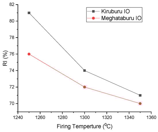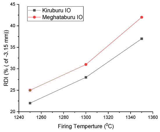 Firing at 1300 °C produces greater strength than 1250 °C but R.D.I. is increased, as per heating, due to bigger pore formation and distribution of ore, causing high R.D.I., as shown in Figure 17. Uneven, the pellet structure at high-temperature hematite ore with coke decreases the pellets’ sintering; hence, R.D.I. increases.