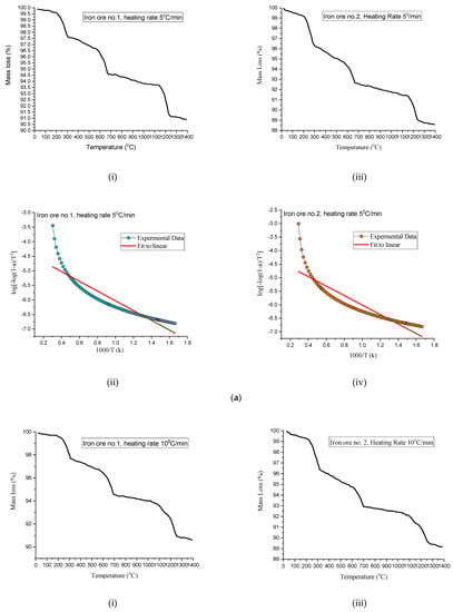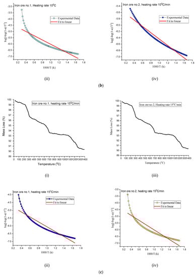 Figure 19 shows (i) mass percentage versus temperature graph, (ii) linear graph for Iron Ore No.1, (iii) mass percentage versus temperature graph, and (iv) linear graph for Iron Ore No.2, when heating rate 5 °C/min was considered. Similarly, Figure 19b,c show that the same mentioned parameters correspond to heating rate of 10 °C/min and 15 °C/min, respectively.
