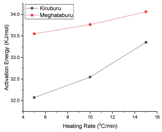 Hematite dissociation is the undesirable reaction during induration for this non-isothermal kinetic model has taken for analysis. A small temperature change governs the hematite dissociation, along with the fineness of ore. TGA was done to get data for conducting kinetic analysis and concluded that the dissociation reaction rate is temperature-dependent: the higher the activation energy value, the higher the temperature dependence. Figure 20 shows that activation energy increases with the heating rate, influencing the hematite dissociation to become more severe with a high heating rate. As compared to Iron Ore No.2, the sample has high activation energy, corresponding to the same heating rate of Iron Ore No.1, and owing to the fineness of ore particles being high for Iron Ore No.2 compared to Iron Ore No.1.