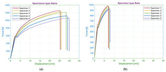The first observed parameter was the orientation of the material pattern in the structure to the loading force. We assessed four fundamental patterns: 45/−45 (alpha), 0/90 (beta), 15/−75 (gamma) and 30/−60 (delta). The force-displacement curves are shown in Figure 9.