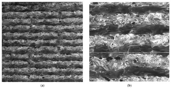 The effects of laminas orientation are also confirmed by images from the failure region of the selected two series of specimens in Figure 13. The crack path is different in both cases. In the case of 0/90 lamina orientation, the crack path is perpendicular to the direction of the loading axis (Figure 13a). In case of 45/−45 infill pattern, the vast majority of the crack path is in the 45/−45 degree to the loading axis (Figure 13b). The sections along the filament are interrupted by very short perpendiculars intersecting this interfilamentous fracture. The presence of walls around the specimen circumference affected the trajectory of the crack in the edge area since the wall filament orientation is parallel to the loading axis and also different to infill pattern orientation. In all series, the crack trajectory depends on the infill pattern orientation to loading.
