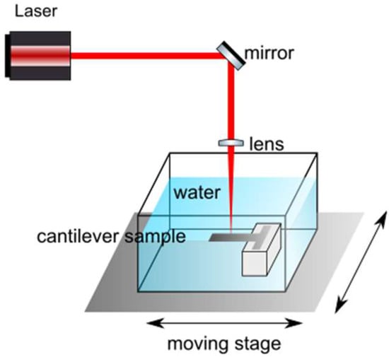 Figure 1 shows an underwater sample set on top of a holder inside a container. The beam is focused on the cantilever section using a fixed lens (Linos Focus-Ronar) with a focal length of . The laser Gaussian beam waist at focus had a radius ; therefore, the Gaussian peak irradiance was and the Gaussian peak fluence was . The container is part of a closed circuit in which distilled and filtered water (to avoid the slag from the process modifying the experiment) circulates through a system of pipes and a pump.