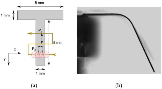 First, -thick cold rolled foils of 316 stainless steel samples were laser cut into a “T” shape (as can be seen in Figure 1 and Figure 2). The top section of the “T” was attached to the edge of a microscope glass slide, leaving the narrower part in a cantilever configuration. That cantilever section was wide and long. The top side of the sample was irradiated by scanning along the X-axis (normal to the longest part of the T), starting and ending at least outside of the sample to avoid any effect that acceleration may have on the edges.