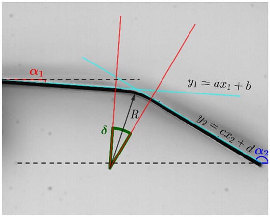 The non-laser-treated regions remain straight, and the deformation is limited to the irradiated area. Therefore, the slopes of the non-treated zones can be compared, and the angle can be calculated as a certain difference between those slopes. This allows us to obtain .