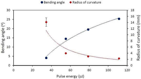 The effect of shows that the more energetic our process is, the greater the bending. The bending angle can be precisely adjusted using specific conditions of and . The largest bending angle was achieved, this being 25.3°, was achieved with the maximum energy per pulse .