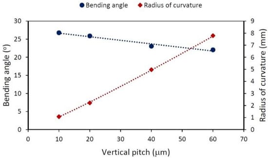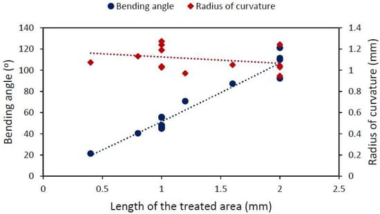 In the previous analysis, the length of the treated area was varied, but was kept constant. The subsequent one was conducted using high energy per pulse ), a repetition rate (and therefore a scanning speed), and the same of , while varying the vertical pitch among and , resulting in treated areas with lengths of and , respectively (every sample has the same number of lines). The bending angle and the radius of curvature are plotted in Figure 6, there is no meaningful variation in the angle with changing ; however, there is a linear relation between and .