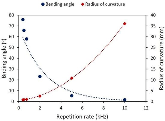 According to Stuart et al., ps and fs lasers should be capable of performing ablation without increasing (or at least doing so only slightly) the temperature of the sample surface [16]. However, when using high-repetition-rate ps lasers for LPF, that slight temperature increase per pulse can accumulate, affecting the performance of the treatment. Figure 7 shows the effect of the repetition rate. All of the samples were shot with in an area with a length of using a vertical pitch. To preserve the number of pulses per spot, the scanning speed was tuned accordingly, always bearing in mind that the density of the energy deposited onto the sample will be the same every time. Those samples irradiated at or lower showed large bending angles. seems to grow exponentially with increasing , which implies that those laser treatments performed at a higher repetition rate are less effective for bending the sample. Moreover, at the highest laser repetition rate used, the bending angle tended to zero.