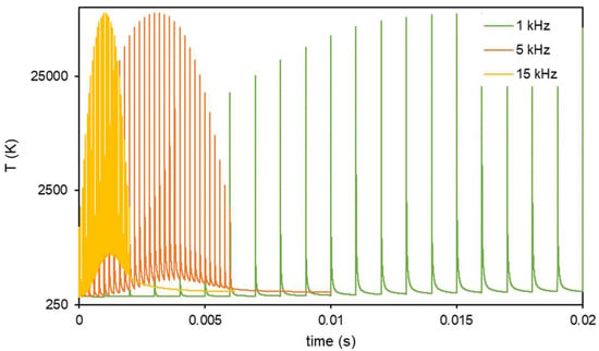 To understand the effect of , FEM simulations (see Appendix A) and a new set of experiments were conducted. Figure 8 plots the effect of different repetition rates computed on the basis of FEM thermal simulations of steel temperature using ps radiation. In summary, a point of the surface receives the energy of a Gaussian beam, and the beam shifts with every pulse; this means that the energy received by the point is different with every pulse. This increases when the beam reaches the point, and decreases when it moves away. As increases, the material heats, and its temperature at the moment at which it receives the next pulse will be higher.