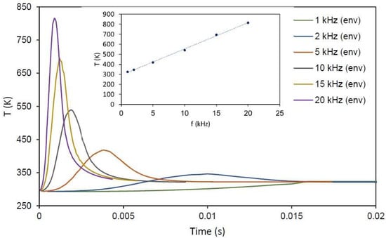 Figure 9 shows the envelope of the minimum values of temperature before every pulse; this time, a wider range of frequencies is shown. The manner in which the temperature piles up can be clearly seen. Additionally, the inset plots the maximum cooling down temperature depending on the repetition rate. For the range of frequencies employed in this study, this relation remains linear.