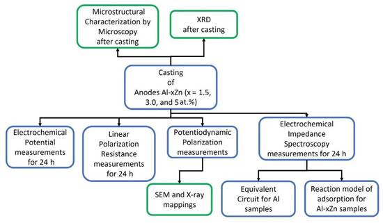 Figure 1 shows a process flow diagram that consists of the experimental stages that involve the alloy AlxZn (x = 1.5, 3, and 5 at.%) production, as well as the microstructural and electrochemical characterization of the as-cast specimens, followed by a microstructural and chemical characterization of the corroded surfaces of the specimens, and finally, an analysis of the EIS data using equivalent circuits and a reaction model of adsorption for the Al-xZn samples.