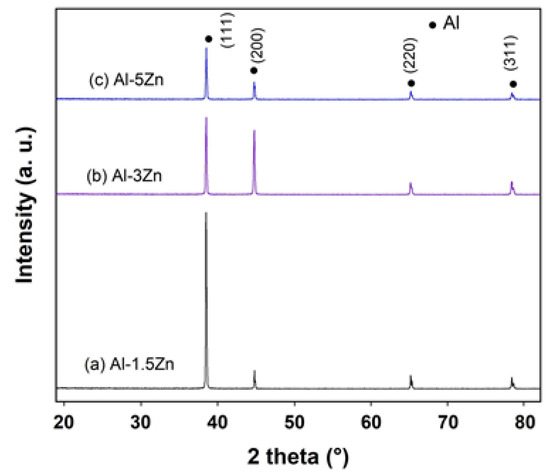 Figure 3 exhibits the X-ray diffraction profiles of as-cast Al-xZn alloys (x = 1.5, 3, and 5 at.%). The diffractograms show that all the diffraction peaks corresponded to the Al element, with their respective (111), (200), (220), and (311) Miller indexes. The addition of Zn to Al did not modify the crystal structure of Al; however, the lattice constant of Al was modified by the solid solution of Zn inside the crystal lattice. Moreover, there was no evidence of any additional peaks belonging to Zn or AlxZny phases. The ratio of intensities I(111)/I(200) was found to be significantly different for each alloy associated with different crystallographic orientations between the materials.