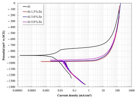 Polarization curves for all the materials are shown in Figure 4. The Al samples displayed a slight pseudo-passivation process at low overpotential, while the samples with Zn exhibited a predominant anodic dissolution without the presence of an observable passivation process. The Zn additions induced a shift of Ecorr toward the active side and increased the corrosion current density Icorr (Table 1). This behavior was reasonable since it was reported that additions of small amounts of Mg, Zn, Hg, and others lead to Al becoming more active [25].