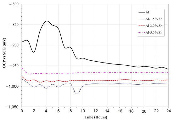 The potential transient during the first 10 h disappeared with the Zn additions, as shown in Figure 5. In this case, the oxide layer formed on the surface of the Al alloy was typically porous and allowed for Cl− ion penetration where the localized failure of the passive layer gave rise to the initiation of pits. Some pits could be susceptible to the repassivation process and others gave rise to the formation of the AlCl4− complex [2]. Alloying elements, such as Zn or In, are added to Al in order not only to shift its operating potential (pitting potential) toward sufficiently electronegative values but also to induce a more uniform corrosion morphology [31]; this was consistent with the disappearance of transients as the Zn concentration increased.