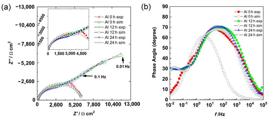 The Bode phase angle and Nyquist diagrams for the Al sample are shown in Figure 7. At 0 h, the presence of a semicircle (Figure 7a) and a well-defined time constant between the high and medium frequency region (Figure 7b) were observed. This could be associated with the capacitive response of the surface. However, at 12 h and 24 h of immersion, in addition to the high- and medium-frequency semicircles, the beginning of another semicircle in the low-frequency region was observed (Figure 7a). From the Bode diagram (Figure 7b), in the low-frequency region, the presence of a time constant (phase angle around 30 degrees) was observed, and in the intermediate-frequency region, a second time constant with a phase angle greater than that of 0 h was observed. The first time constant could be associated with the formation of a layer of corrosion products, while the second time constant was associated with the capacitive response of the surface.