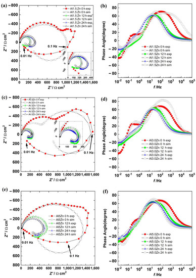 Nyquist diagrams: (a) Al-1.5Zn, (c) Al-3.0Zn, and (e) Al-5.0Zn. Bode diagrams: (b) Al-1.5Zn, (d) Al-3.0Zn, and (f) Al-5Zn.