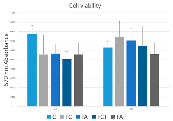 Table 1 represents the descriptive statistics of the test groups at each time interval, while Figure 1 illustrates the box plot of cell viability within different groups and different time intervals. The cell viability in C after 24 h was significantly higher than that after 72 h (p = 0.01), whereas FA had higher cell viability after 72 h than after 24 h (p = 0.019). At different time intervals, the differences were nonsignificant within FC, FCT, and FAT (p ≥ 0.092).
