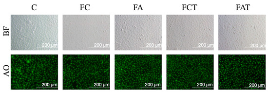 Bright field (BF) and acridine orange (AO) fluorescent images of L929 cell morphology after 24 h of incubation with eluates of materials. Cell morphology is similar to control, and green nucleus represents healthy cells. The images were captured multiple times and 20× magnification was used (IX70 Olympus, FITC, 460–490 nm fluorescent attachment, Tokyo, Japan).