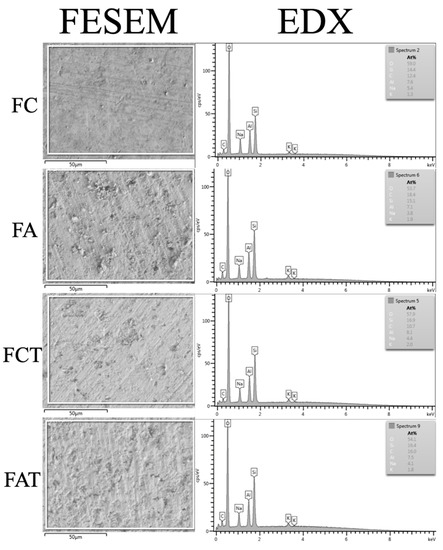 Field emission scanning electron microscope (FESEM) images and energy dispersive X-ray spectroscopy (EDX) analysis of material groups (C: carbon; O: oxygen; Na: sodium; Al: aluminum; Si: silicon; K: potassium).