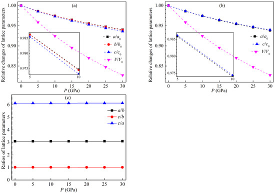 The optimized lattice constants and unit cell volumes of the LPSs h- and r-AlTi under pressure up to 30 GPa at 0 K are listed in Table 2. Various structural parameters of both LPSs at 0 K decrease monotonically with increasing pressure. The relative changes of these parameters and the ratios of lattice parameters for both LPSs at 0 K as a function of pressure are plotted in Figure 2. One can see from Figure 2a,b that these relative changes gradually reduce as the pressues increases, and the relative change of the volume decreases more rapidly than those of the lattice constants. Meanwhile, the decrease of the for the h LPS is slightly faster than that of its and slightly slower than that of its , whereas the decrease of the for the r LPS is slightly faster than that of the counterpart . These show that the incompressibility of the b axis is slightly weaker than that of the a axis and slightly stronger than that of the c axis for the h LPS, while the incompressibility of the a axis is slightly weaker than that of the c one for the r LPS. One can also see from Figure 2c that the ratios of and for the h LPS and for the r one are all almost unchanged with increasing the pressure, meaning that both LPSs have a pressure isotropic structure.