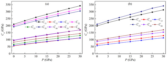 Various elastic constants of both LPSs at 0 K as a function of pressure are plotted in Figure 3. Clearly, each elastic constant increases rapidly with increasing the pressure, and the constants , , are relatively more sensitive to pressure than the other constants. All of the elastic constants exhibit a linear growth trend with increasing the pressure. For the h LPS, the linear relationships between the elastic constants and the pressure P are as follows: