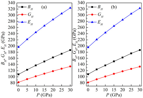 The elastic moduli , , of both LPSs at 0 K as a function of pressure are plotted in Figure 5. Similar to the elastic constants, the values of , and increase rapidly with increasing the pressure, and the modulus is relatively more sensitive to pressure than the other two. They exhibit a linear growth trend as the pressure increases. For the h LPS, the linear relationships between the moduli , , and the pressure P are as follows: