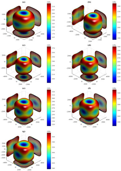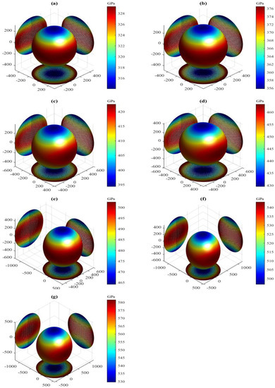 The present orientation dependences of Young’s modulus for the LPSs h- and r-AlTi under pressure up to 30 GPa at 0 K are shown in Figure 10 and Figure 11, respectively. Similar to the shear modulus above, all 3D shapes of Young’s modulus for both LPSs at 0 K also have a very strong nonsphericity, showing their very significant anisotropies. The obtained external values , and the ratio of both LPSs under pressure up to 30 GPa at 0 K are listed in Table 7. The two extremes of the h and r LPSs at 0 K are increased gradually with increasing the pressure. Their ratios are significantly greater than one and increase gradually with increasing the pressure in the studied entire pressure range, showing the increase of their strong anisotropies with pressure. At identical pressures the value of the h LPS is always larger than that of the r one, showing the stronger anisotropy of the h LPS than the r one in the pressure range between 0 and 30 GPa.