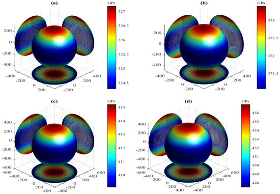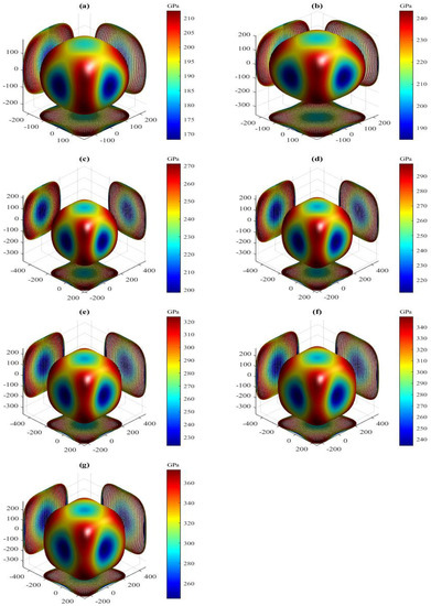 Elastic anisotropy plays an important role in diverse applications of crystalline materials such as the mechanical properties of nickel-based superalloys, microscale cracking in ceramics, phase transformations, dislocation dynamics, development of plastic deformation, enhanced positively charged defect mobility, alignment or misalignment of quantum dots, texture in nanoscale shape-memory alloys, and plastic relaxation in thin-film metallics [38,39]. In terms of elastic compliances (), the variation of bulk modulus with direction for an orthorhombic crystal can be calculated by [40]