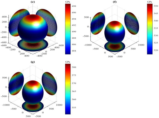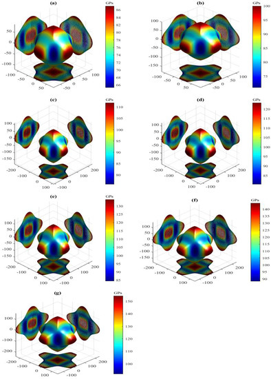 Directional dependence of Young’s modulus for the LPS h-AlTi under pressure (a) 0 GPa, (b) 5 GPa, (c) 10 GPa, (d) 15 GPa (e) 20 GPa, (f) 25 GPa and (g) 30 GPa at 0 K.