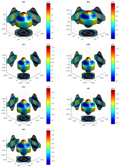 Directional dependence of Young’s modulus for the LPS r-AlTi under pressure (a) 0 GPa, (b) 5 GPa, (c) 10 GPa, (d) 15 GPa (e) 20 GPa, (f) 25 GPa and (g) 30 GPa at 0 K.