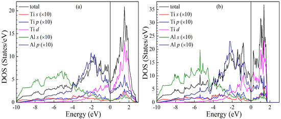 The total and partial electronic densities of states (DOSs) of the LPSs h- and r-AlTi under different pressures at 0 K are calculated to fully understand the pressure effect on their structural and elastic properties. The obtained DOSs of both LPSs at zero pressure are plotted in Figure 12, in which except for Ti d DOS, the values of the other partial DOSs are enlarged by 10 times. The distribution curves of these total and partial DOSs are in good agreement with the results of the literature [25]. As can be clearly seen from Figure 12a, in the lower energy region between −10.0 and −4.0 eV, the total DOSs of the h LPS dominantly originate from the s states of Al, in the energy region between −4.0 and 0.0 eV, its total DOSs are determined by both Al p and Ti d states, and in the higher energy region between 0.0 and 3.0 eV, its total DOSs are mainly due to the contributions of Ti d electrons. Meanwhile, the DOS profiles for both Al p and Ti d are very similar in the energy range from −4.0 to 3.0 eV, reflecting the strong hybridization between these two orbits. Moreover, there is the observation of a pseudogap near the Femi level in the total DOS of the h LPS. The pseudogap also shows the appearance of the hybridization in the h one. These facts suggest that covalent bonds exist in the h LPS.