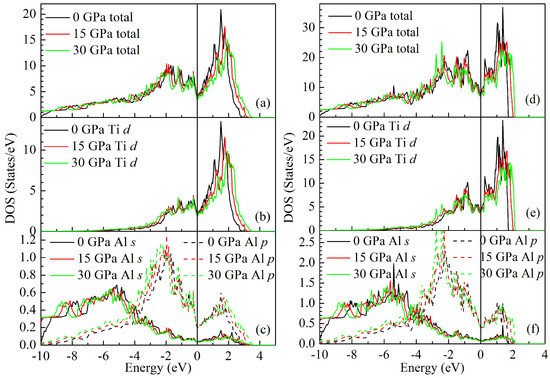 The obtained total DOSs of the LPS h- and r-AlTi at 0, 15 and 30 GPa are plotted in Figure 13, together with the partial DOSs of Al s, p and Ti d electrons. Clearly, the profiles of the total and partial DOSs for both LPSs are changed slightly with increasing the pressure. It is indicated that both LPSs are still structurally stable under pressure up to 30 GPa, and the types of their orbital hybridization are unchanged with increasing pressure. Owing to the presence of the pseudogap, the total DOSs of both LPSs at different pressures can be divided into one low energy bonding and the other high energy antibonding regions. It can be clearly seen from Figure 13a,d that as the pressure increases, the DOS peaks in the bonding region shift to the lower energy region and those in the antibonding region shift to the higher energy region. This situation results in the wider pseudogaps of both LPSs with pressure, meaning that they have more covalent bonding with pressure. Comparing Figure 13b with Figure 13c carefully, it can be found that the DOS profiles in the energy region between −4.0 and 3.0 eV for both Ti d and Al p orbits become more similar with increasing the pressure. A similar phenomenon can also be observed by carefully comparing Figure 13e with Figure 13f. These also show the stronger hybridization between Ti d and Al p for both LPSs with pressure. Consequently, both LPSs become more brittle with pressure. These are consistent with the above analysis of structural and elastic properties.