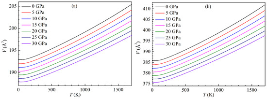 Temperature dependence of volume V for the LPSs (a) h- and (b) r-AlTi under pressure up to 30 GPa.