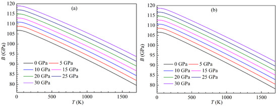The present variations of the isothermal bulk moduli with temperature for both LPSs under pressure up to 30 GPa are plotted in Figure 15. One can clearly see that the bulk moduli of both LPSs at a given pressure can decrease with rising the temperature, while their bulk moduli at a given temperature can increase with increasing the pressure. Similar to the changes of the volumes with temperature and pressure, the bulk moduli of both LPSs under various pressures show a slight decrease up to about 100 K and then a linear trend of sharp decrease at higher temperatures. The curves of the temperature dependent moduli under various pressures for either LPS are almost parallel to each other, and thus the modulus difference of either LPS at two pressures is almost unchanged with rising the temperature. These indicate the mechanical stabilities of both LPSs over the studied temperature and pressure ranges. At zero temperature and pressure, the bulk moduli of the h and r LPSs correspond to 106.78 and 106.56 GPa, which are also well self-consistent with those (107.91 and 108.42 GPa) of the above elastic properties.