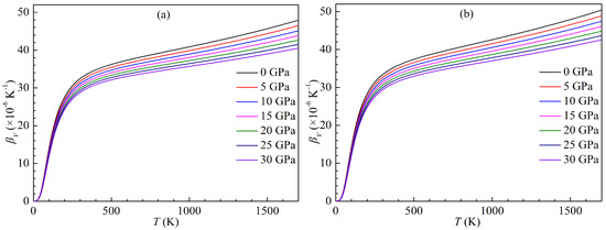 where, (T) is the equilibrium volume at T. The present variations of the volumetric thermal expansion coefficient with temperature for both LPSs under pressure up to 30 GPa are plotted in Figure 16. It is clear that as the temperature rises, the thermal expansion coefficients of either LPS at a given pressure dramatically increase at low temperature (<300 K) and then gradually tend to a linear growth at high temperature (>300 K), while the thermal expansion coefficients of either LPS at a given temperature decrease with increasing the pressure, and the higher the temperature, the faster the coefficients decrease. The effects of the pressure on the coefficients for either LPS are small at low temperature, and then increase with the rising temperature.