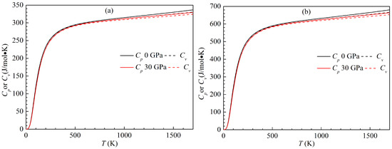Heat capacity is one of the most essential thermodynamic properties of solids. The present variations of the heat capacity with temperature for the LPSs h- and r-AlTi at 0 and 30 GPa are plotted in Figure 17. In the figure, and denote the heat capacity at constant pressure and constant volume, respectively. At a given pressure, the difference between and for both LPSs can be calculated as . Clearly, the difference between and for either LPS at any pressure is very small in the temperature range from 0 to 1700 K. Meanwhile, the heat capacities and of either LPS increase with rising the temperature at identical pressure and decrease with increasing the pressure at identical temperature. The effects of the temperature on their heat capacities are much more significant than those of the pressure. At low temperature (300 K), the temperature dependent curves of and for both LPSs are similar to each other, which are proportional to . At high temperature (>300 K), the curve of either LPS tend to be linear with temperature, while the curve gradually deviates from the one with temperature and approaches the Dulong–Petit limit.